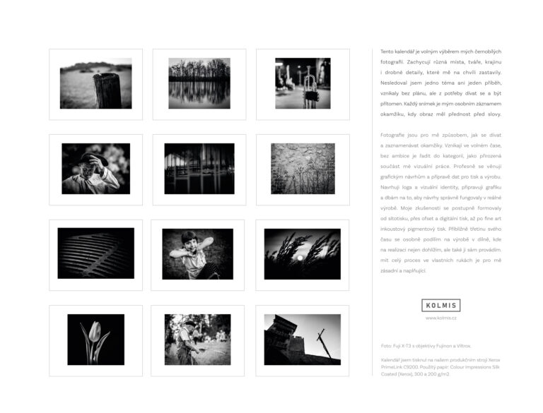 Nabízím kalendář, který jsem zpracoval z fotografií pořízených v posledních letech ve volném čase. Jde o volný výběr černobílých snímků z různých míst - krajina, tváře, momenty i drobné detaily, které mě na chvíli zastavily.
